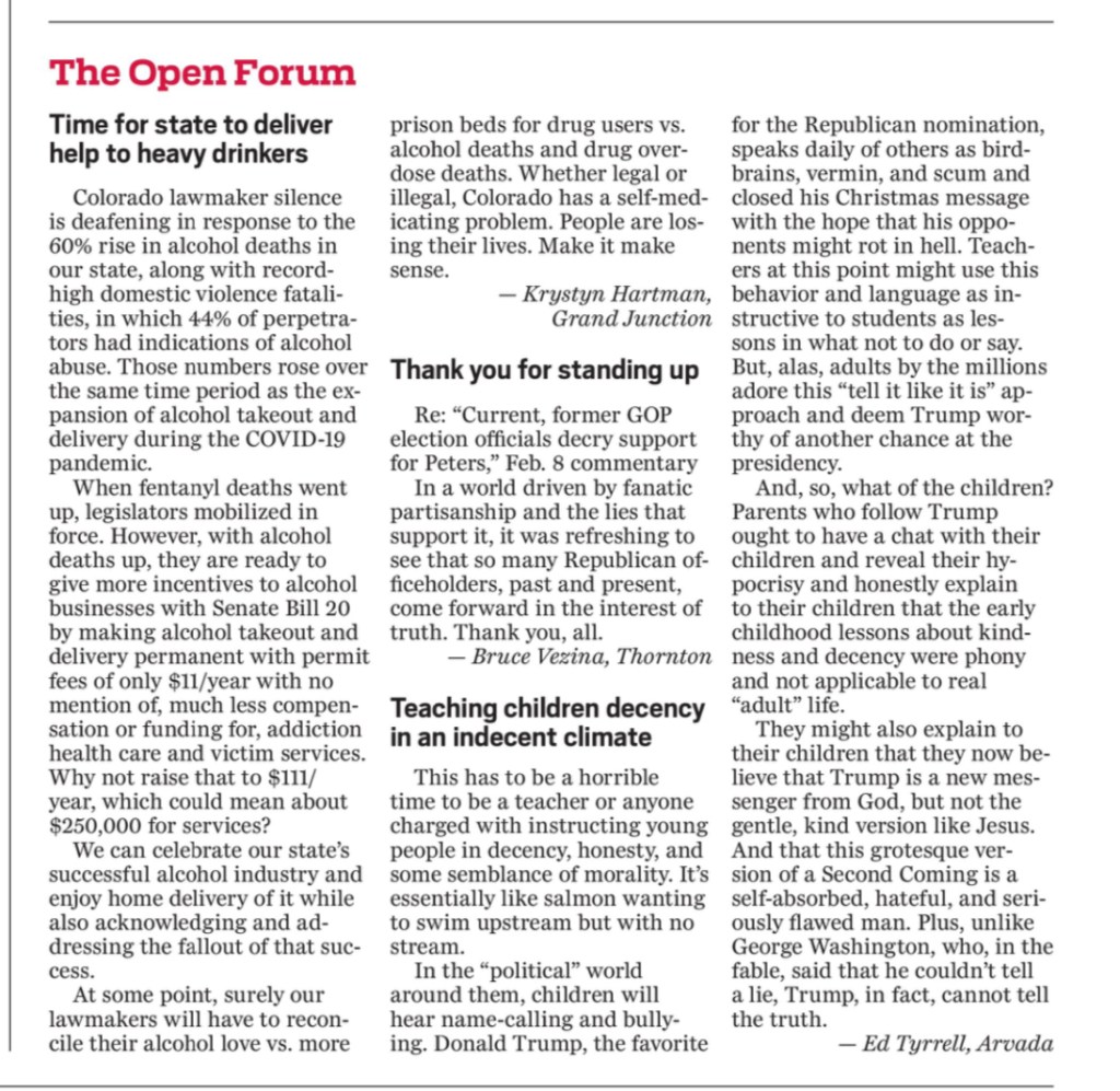 After sending daily emails to the sponsors of SB24-020 on alcohol takeout and delivery with no response at all, it occurred to me that maybe my emails were going to their spam folders and that they aren’t seeing them, so I sent a letter to the editor of The Denver Post hoping they’d run it and that the bill’s sponsors might then see it. It was a chance worth taking. They published it in today’s print edition Friday, February 9, 2024 with the title Time for state to deliver help to heavy drinkers. And no, I didn’t come up with that, they did. (Their Forum editor CJ is really good.) Hopefully, the bill’s sponsors will see it.