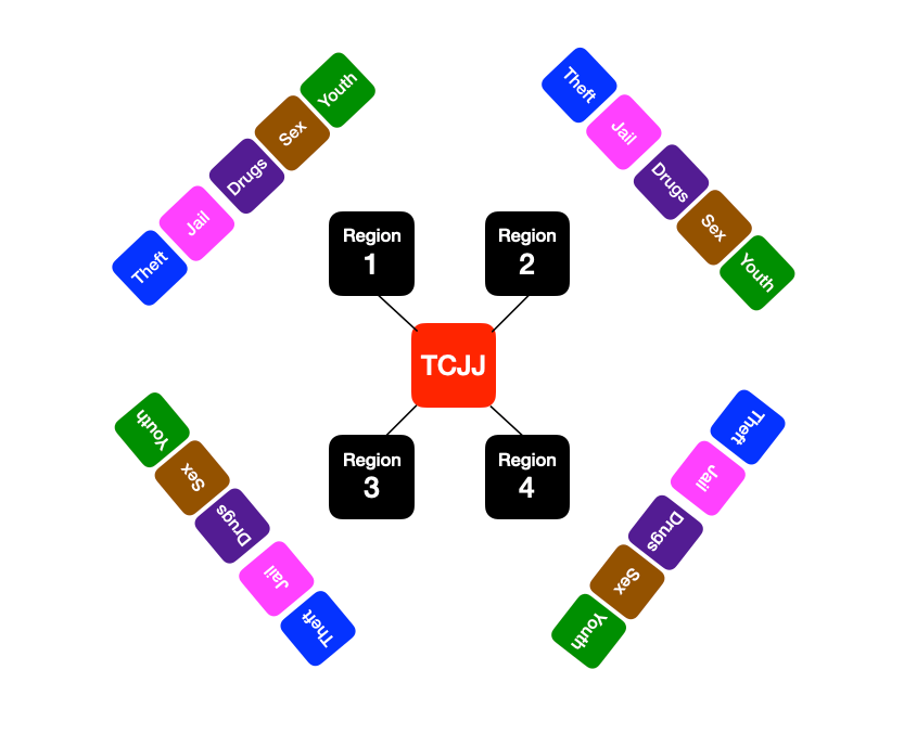 The chart below is a simplified structure to demonstrate the concept. There would be more regions and more policy areas of course.